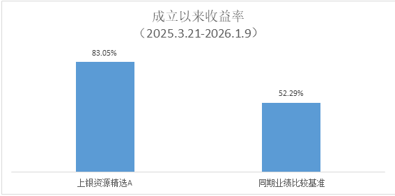 注:上银资源精选C成立以来至2026年1月9日业绩/业绩比较基准数据位82.55%/52.29%,上银资源精选A、C业绩数据、同期业绩比较基准来源于Wind,数据区间:2025.03.21-2026.1.9。业绩数据已经托管行复核。上银资源精选混合发起式成立于2025年3月21日,其业绩比较基准为中证内地资源主题指数收益率*80%+中证港股通综合指数收益率*10%+中证综合债券指数收益率*10%,A类份额成立以来至2025年9月30日收益率/业绩比较基准收益率为40.98%/29.27%,C类份额成立以来至2025年9月30日收益率/业绩比较基准为40.69%/29.27%。现任基金经理任职情况:卢扬2025年3月21日至今。上银资源精选A类份额申购费率为(M为投资金额,含申购费):M<100万元收取1.50%,100万元≤M<200万元收取1.20%,200万元≤M<500 万元收取0.80%,M≥500万元收取每笔1000元;A类份额赎回费率为(N为持有期限):N<7日收取1.50%,7日≤N<30日收取0.75%,30日≤N<180日收取0.50%,N≥180日不收取;C类份额不收取申购费,销售服务费费率为0.40%/年,赎回费率为(N为持有期限):N<7日收取1.50%,7日≤N<30日收取0.50%,N≥30日不收取。