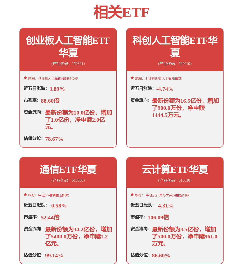 通信ETF华夏(515050)跟踪中证5G通信主题指数,深度聚焦电子(芯片、PCB、消费电子)+通信(光模块、服务器)算力硬件。前五大持仓股:中际旭创、新易盛、立讯精密、工业富联、兆易创新。场外联接(A类:008086;C类:008087)