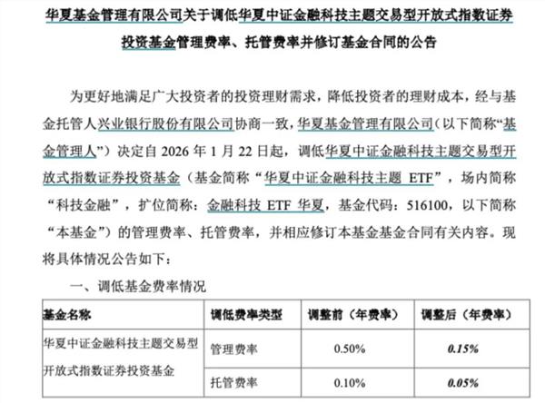 日前,华夏基金发布公告称,为了更好地服务广大投资者,降低投资者的理财成本,自2026年1月22日起,调低金融科技ETF华夏的管理费率、托管费率,并相应修改基金合同有关内容。其中,管理费率年费率由0.50%下调至0.15%,托管费率年费率由0.10%下调至0.05%,两项费率调降幅度分别达到70%和50%。