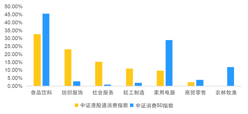 先从行业分布来看,中证港股通消费主题指数更偏服务,重在非白酒的食品饮料、纺织服饰与社会服务等行业,细分方向上还覆盖了酒店餐饮、旅游景区、线下零售等服务消费相关标的。中证消费50指数则更偏商品,主要是白酒、家电、农林牧渔等商品消费行业。