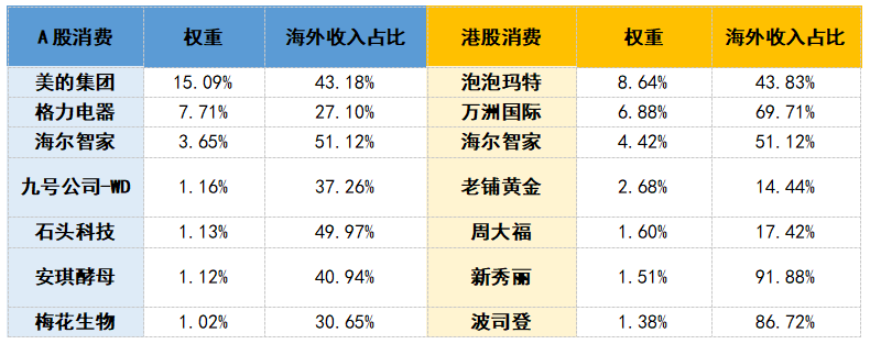 表:指数高海外收入占比权重股对比