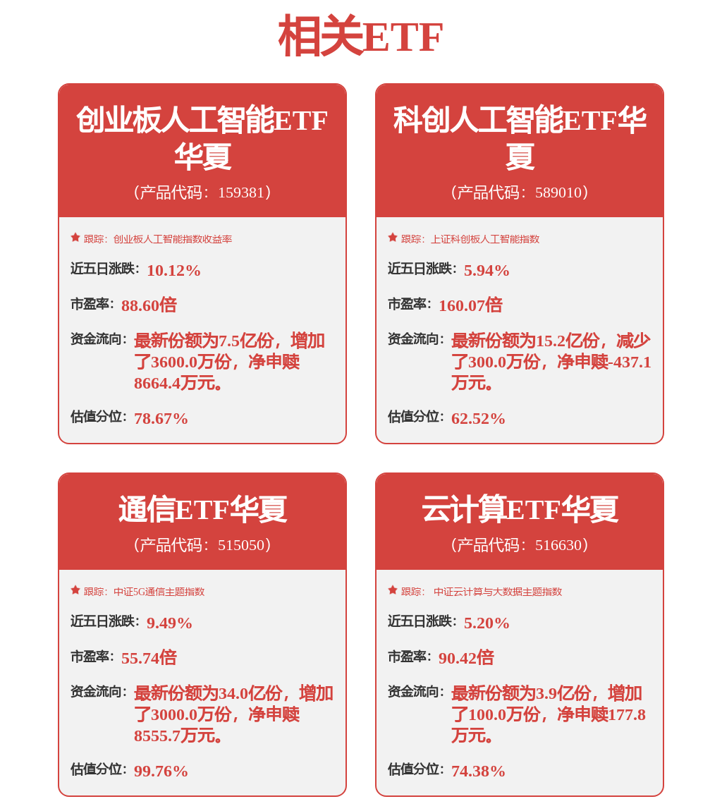 创业板人工智能ETF华夏(159381):跟踪指数的一半权重集中在光模块CPO板块,另一半权重覆盖国产算力、AI软件应用领域,形成“硬件+应用”的均衡布局。前10大权重股为中际旭创(15%)、新易盛(15%)、天孚通信(7%)、润泽科技、蓝色光标、协创数据、昆仑万维、北京君正、网宿科技、同花顺。目前基金规模近20亿元,场内综合费率仅0.20%,为同类最低,适合追求高弹性、看好AI+主线的投资者。场外联接(A类:025505;C类:025506)。